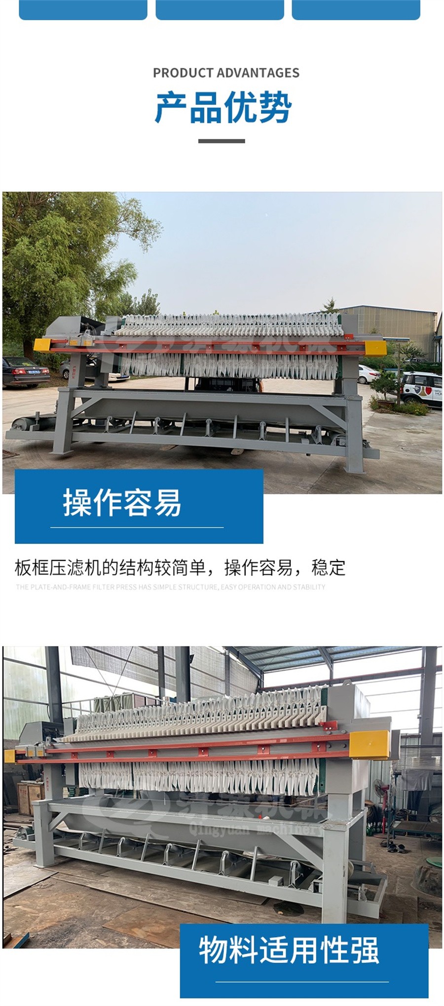 三、優(yōu)點:板框式壓濾機的優(yōu)點是:結(jié)構(gòu)較簡單,操作容易,運行穩(wěn)定,保養(yǎng)方便;過濾面積選擇范圍靈活,占地少;對物料適應(yīng)性強,適用于各種中小型污泥脫水處理的場合。