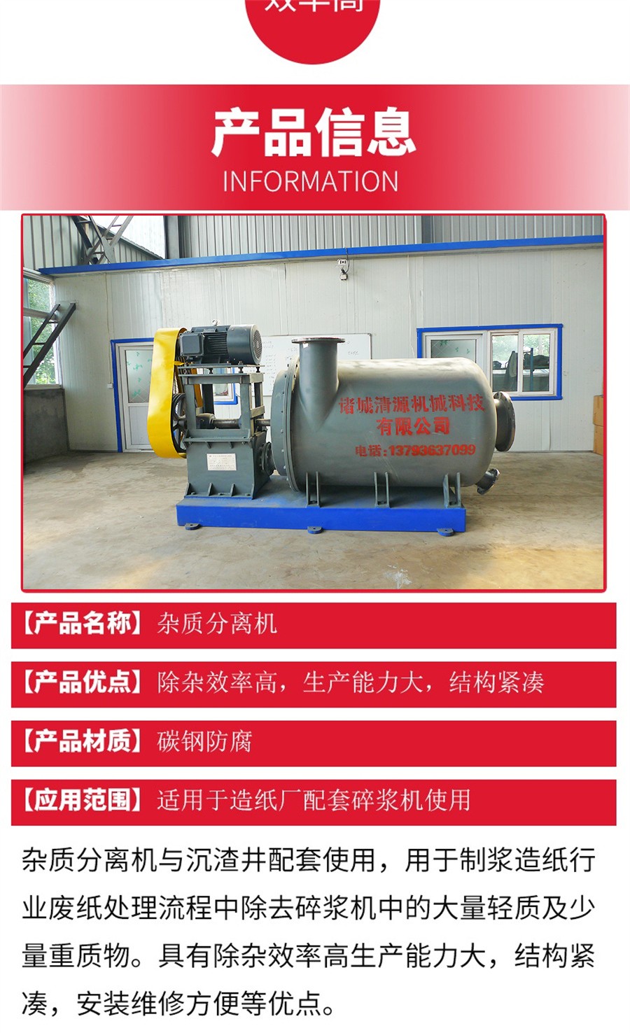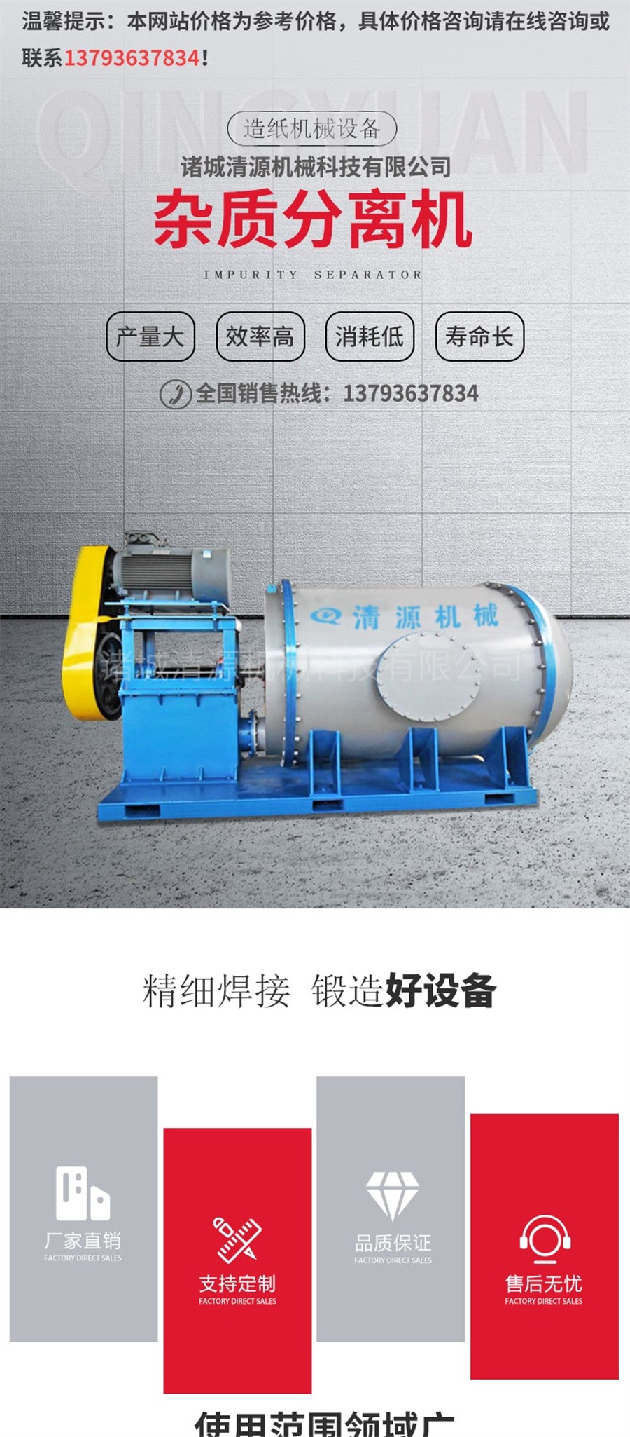 雜質(zhì)分離機(jī)內(nèi)有特別設(shè)計(jì)的低摩擦葉片水力型轉(zhuǎn)子,能使進(jìn)入的漿料均勻分散,保持篩板不阻塞并防止雜質(zhì)破碎。輕雜質(zhì)經(jīng)粗選機(jī)頂部出口排出,進(jìn)入圓筒篩進(jìn)行進(jìn)一步的分離,重雜質(zhì)經(jīng)粗選機(jī)的底部排出,除雜后的漿料經(jīng)過后部篩板由出漿管送出。